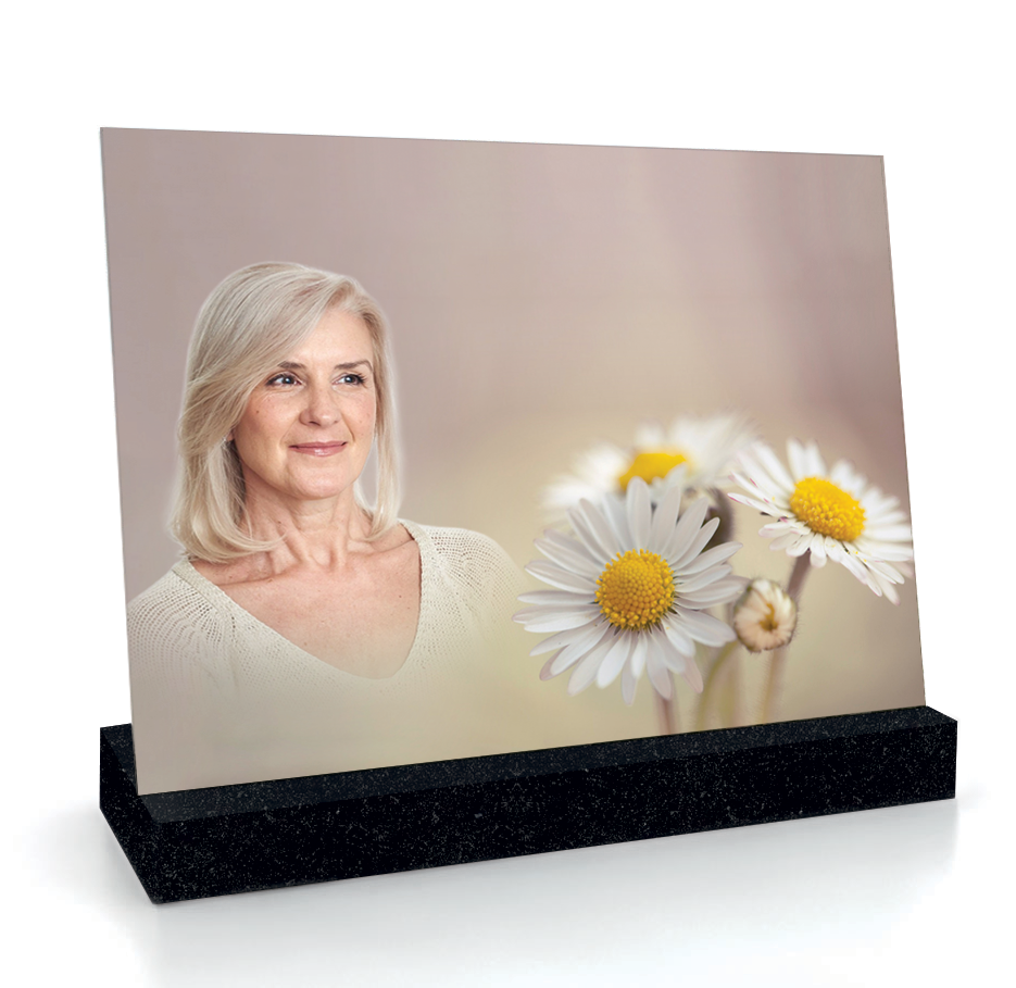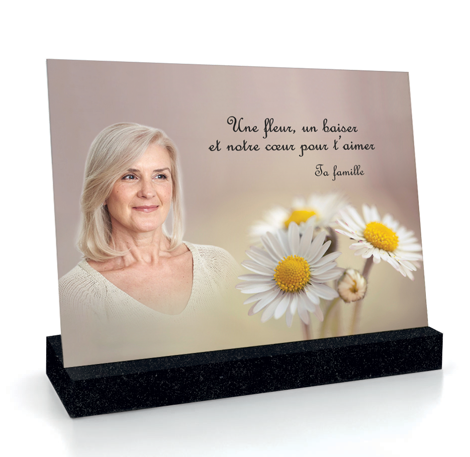 Honorez la mémoire d’un être cher avec notre plaque funéraire raffinée et unique. Fabriquée en France, elle se décline en verre de sécurité (garantie 30 ans) sur socle, en fixation murale ou seule. Vous la personnalisez en 4 étapes simples : modèle, choix du fond ou du motif, texte libre, photo. Impression haute définition qui sublime les couleurs. Fixation possible murale ou sur socle en marbre de Carrare, granit gris de Tarn ou granit noir Impala. Livraison rapide selon vos besoins.