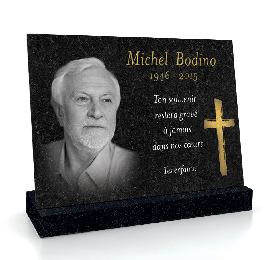 Rendez hommage à vos proches avec une plaque funéraire élégante et unique. Personnalisez-la facilement avec photo et texte. Fabrication française, qualité durable, impression haute définition.