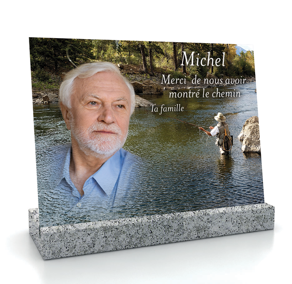 Honorez la mémoire d’un être cher avec notre plaque funéraire raffinée et unique. Fabriquée en France, elle se décline en verre de sécurité (garantie 30 ans) sur socle, en fixation murale ou seule. Vous la personnalisez en 4 étapes simples : modèle, choix du fond ou du motif, texte libre, photo. Impression haute définition qui sublime les couleurs. Fixation possible murale ou sur socle en marbre de Carrare, granit gris de Tarn ou granit noir Impala. Livraison rapide selon vos besoins.
